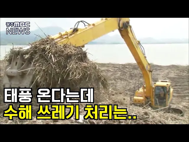 (앵커) 기록적인 폭우로 인한 상처가 아물지도 않았는데 제8호 태풍 바비가 북상하고 있습니다. 영산강엔 폭우 때 떠내려온 쓰레기가 아직 수거되지 않은 상황이어서 하류지역 지자체들이 긴장하고 있습니다. 김안수 기자가 취재했습니다. (기자 리포트) 영산강 끝자락 200여미터 길이의 제방을 따라 쓰레기 산이 펼쳐져 있...