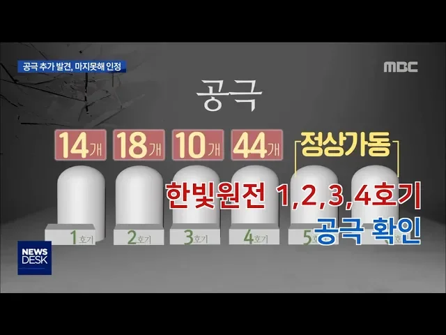 (앵커) 한빛원전 원자로의 콘크리트 공극이 그동안 알려진 원전 2호기와 4호기 말고도 1호기와 3호기에서도 발견된 것으로 확인됐습니다. 한빛원전은 설명회를 열어 이같은 사실을 밝혔는데, 그 과정이 썩 투명하지는 않았습니다. 남궁 욱 기자가 취재했습니다. (기자) 한빛원전 4호기 원자로를 둘러싼 격납건물 콘크리트의...