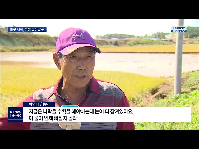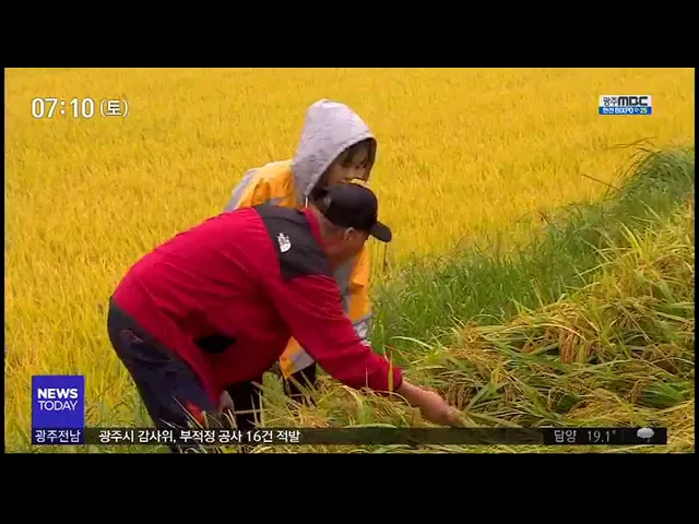 ◀ANC▶ 태풍 콩레이가 북상하면서 벼 재배 농민들이 특히 걱정입니다. 이삭이 여물대로 여물어 비바람에 쓰러짐 피해가 날 수 밖에 없기 때문입니다. 윤수진 기자가 취재 했습니다. ◀END▶ (영암군 학산면) 누렇게 익은 벼들이 이른 아침부터 내린 비에 맥없이 쓰러지고 있습니다. 물기를 머금은 이삭이 무게를 견디지 ...