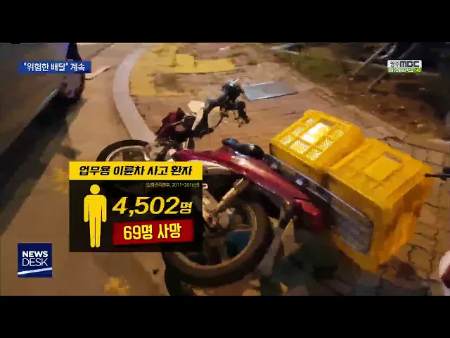 ◀ANC▶ 음식 배달을 하는 오토바이 사고가 끊이지 않고 있습니다. 최근 6년 간의 사고를 분석해봤더니 젊은 배달원 그리고 저녁 시간대에 특히 위험한 곡예 운전이 많았습니다. 김진선 기자가 보도합니다. ◀END▶ ◀VCR▶ 신호등 없는 사거리 한복판에 오토바이가 쓰러져있습니다. 음식점 배달원인 18살 김 모 씨의 오...