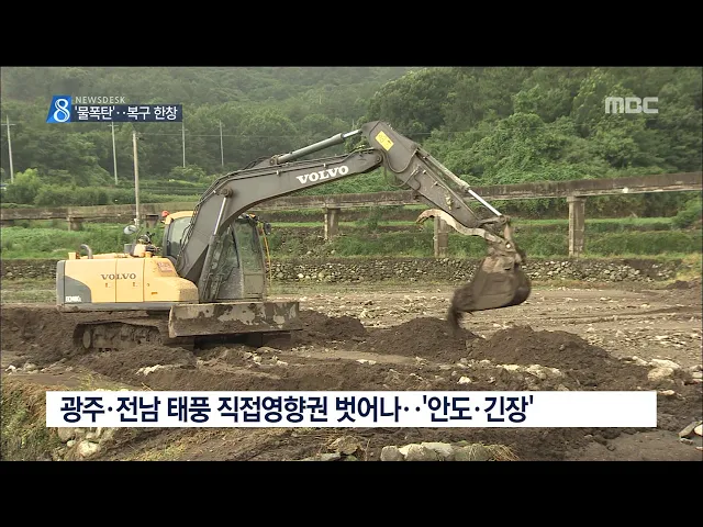 ◀ANC▶ 지난 주말 사이에 내린 집중호우로 피해가 발생한 지역에서는 오늘 하루종일 긴급 복구가 이뤄졌습니다. 태풍의 진로가 당초 예상보다 더 동쪽으로 비껴가면서 광주와 전남지역은 태풍의 직접 영향권에서는 벗어났지만 강풍에는 여전히 대비가 필요합니다. 김인정 기자입니다. ◀VCR▶ 보성에 쏟아진 물폭탄에 침...