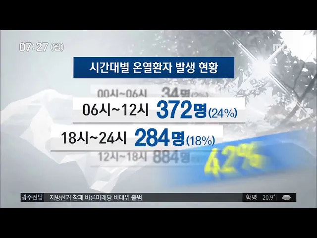 ◀ANC▶ 낮 기온이 30도 가까이 오르면서 열사병 같은 온열환자도 늘고 있습니다. 오전과 밤에도 온열 질환이 발생할 수 있는 데다 전남은 무더위에 취약한 고령인구가 많아 각별한 주의가 필요합니다. 문형철 기자입니다. ◀VCR▶ [C/G 1] 지난해 발생한 온열환자는 모두 천 5백여 명. 이 가운데 전남지역 환자는 190여 ...
