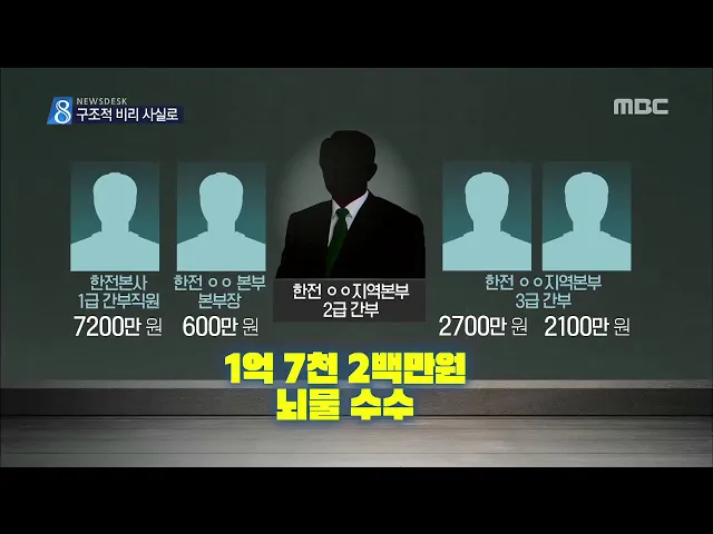 ◀ANC▶ 입찰 비리로 수차례 물의를 빚어왔던 한국전력에서 이번에는 대형 뇌물 비리가 적발됐습니다. 전기공사 업자들과 한전 간부들 사이에 오간 검은 돈이 5억원대에 이를 정돈데요.. 한전 본사 상임이사부터 지역본부 간부까지 얽힌 구조적 비리였습니다. 김인정 기자입니다. ◀VCR▶ 전기공사업체들에게 뇌물을 받은...