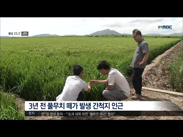 ◀ANC▶ 3년 전 메뚜기 종류인 '풀무치' 떼가 나타나 큰 피해를 입었던 해남 간척지에서 올해는 귀뚜라미 떼가 출몰해 피해를 입고 있습니다. 그런데 원인을 조사해 봤더니, 결과는 뜻밖이었습니다. 박영훈 기자입니다. ◀END▶ 해남의 대규모 간척 농경지입니다. 둑에 자란 풀을 헤치자 진한 흑갈색의 곤충들이 놀라 달...