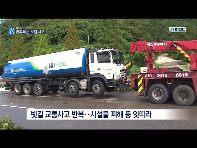 ◀ANC▶ 여수산단 진입도로에서 빗길 교통사고가 끊임없이 되풀이되고 있습니다. 사고가 났다 하면 크나큰 피해로 이어지는 경우가 많고, 2차 사고의 위험도 높지만, 대책은 미흡하기만 합니다. 문형철 기자입니다. ◀VCR▶ 기름 운반차가 옆으로 기운 채 중앙분리대를 따라 수십 미터를 미끄러집니다. 대형 트레일러가 ...