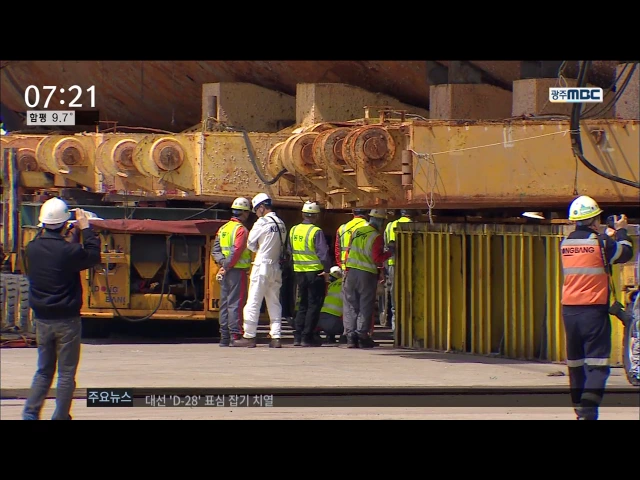 ◀ANC▶ 세월호가 반잠수식 선박에 실려 목포신항에 도착한 지 열흘 만에 마침내 육지에 올려졌습니다. 선체 무게 논란과 연이은 운송 실패로 희생자 가족들은 지난 3년 보다 더 초조한 열흘을 보냈습니다. 김진선 기자입니다. ◀END▶ ◀VCR▶ 세월호를 실은 반잠수식 선박이 목포신항에 접안한 건 지난달 31일. 인양이...