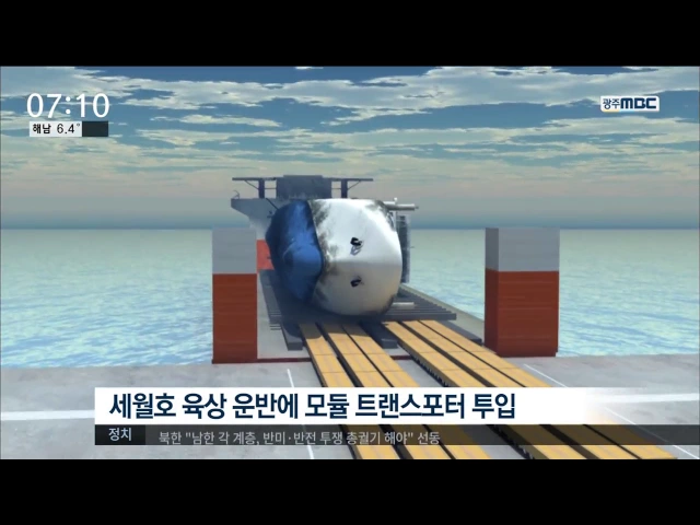 ◀ANC▶ 목포신항에 자리한 세월호에서는 육상거치를 위한 준비가 이뤄지고 있는데요. 그동안 세월호 화물칸 입구에 걸려 있었던 일부 화물이 제거된 것이 확인됐습니다. 김진선 기자가 취재했습니다. ◀END▶ ◀VCR▶ 굴삭기와 승용차가 세월호 화물칸 입구에 걸려 있습니다. 세월호를 실은 반잠수식 선박이 완전 부양...
