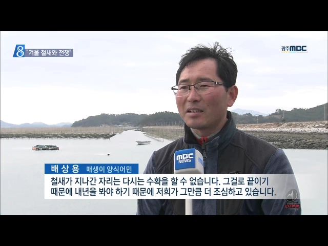 ◀ANC▶ 요즘 김과 매생이 양식장에서는 어민들이 철새와 밤낮없는 전쟁을 치르고 있습니다. 철새떼가 지나간 자리는 쑥대밭으로 변해버리기 때문에 어민들도 필사적입니다. 문연철 기자가 취재했습니다. ◀END▶ 완도 약산도의 한 매생이 양식장. 매생이 발이 수면 위로 노출되는 시간이 되자 청둥오리떼가 찾아들기 시...