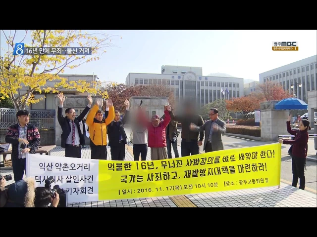 ◀ANC▶ 익산 약촌오거리 살인사건의 피고인에게 16년만에 무죄가 선고됐습니다. 지난 삼례 3인조 강도치사 사건에 이어 또 다시 재심사건에서 무죄가 선고돼 우리 사법체계 전반에 대한 불신이 커지고 있습니다. 보도에 강동엽 기자입니다. ◀END▶ ◀VCR▶ 지난 2000년 익산 약촌오거리 택시기사 살인사건 범인으로 지...