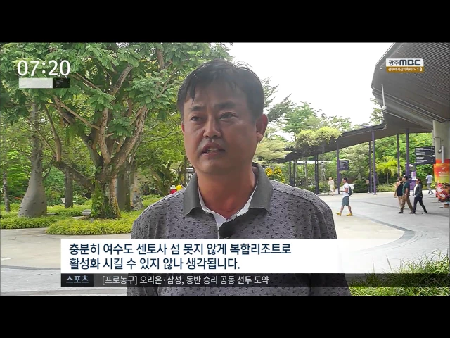 ◀ANC▶ 남해안 관광 활성화 방향을 모색해보는 순서입니다. 오늘은 주민 참여와 투자의 중요성을 짚어봅니다. 김종태 기자가 보도합니다. ◀END▶ 싱가폴 센토사 섬은 싱가폴 본 섬과 1킬로미터도 떨어져 있지 않습니다. 섬과 섬을 잇는 이동수단은 차량외에 해상을 가로지르는 케이블카로 관광 가치를 높혔습니다. 센토...