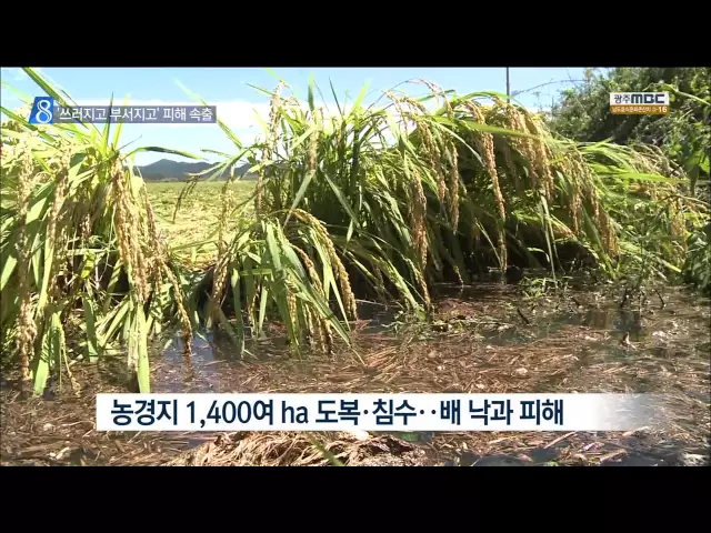 ◀ANC▶ 태풍이 몰고 온 강한 바람과 비는 전남지역에도 적지않은 생채기를 남겼습니다. 시설물 파손과 낙과 피해가 잇따랐고 3천여 가구가 정전되기도 했습니다. 피해 대부분이 전남 동부권에 집중됐습니다. 보도에 문형철 기자입니다. ◀VCR▶ 상가에서 떨어져 나온 대형 간판이 인도를 덮쳤습니다. 거센 비바람에 상가...