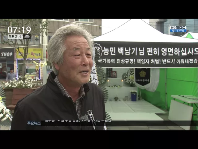 ◀ANC▶ 경찰이 쏜 물대포에 맞아 의식불명에 빠졌던 백남기 농민이 끝내 숨지며 국가폭력 논란을 둘러싼 사회적 파장이 점차 확산되고 있습니다. 서울에서는 갈등과 대치가 이어지는 가운데 그의 고향인 보성에서는 친구와 이웃들이 깊은 슬픔에 잠겨있습니다. 김인정 기자입니다. ◀VCR▶ 보성역 앞에 꾸려진 단촐한 분...