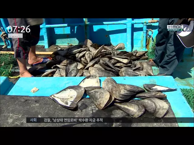 ◀ANC▶ 고수온에 따른 남해안 양식장 피해가 눈덩이처럼 불어나고 있습니다. 전국 최대 키조개 주산지인 득량만은 바닷속이 말 그대로 폐허로 변해버렸습니다. 문연철기자가 취재했습니다. ◀END▶ ◀VCR▶ 국내 키조개 90퍼센트를 생산하는 장흥 득량만. 고수온 피해가 심한 바닷속 양식장을 들어가봤습니다. 뻘속에 ...