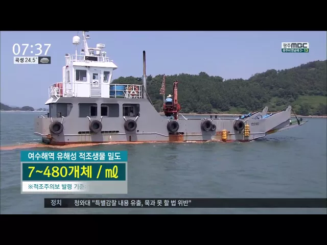◀ANC▶ 여수해역을 중심으로 적조주의보가 내려지면서 지자체가 방제작업에 나섰습니다. 고수온에 이어 적조까지 겹쳐 어민들의 걱정이 이만저만이 아닙니다. 문형철 기자입니다. ◀VCR▶ 가두리 양식장이 밀집해 있는 여수 돌산 앞바다. 검붉은 빛깔의 긴 적조띠가 곳곳에 퍼져 있습니다. 방제선은 호스를 이용해 연신 ...