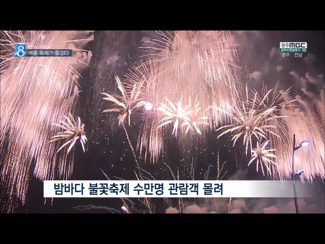 ◀ANC▶ 30도를 넘는 무더운 날씨속에서도 휴가철을 맞아 광주,전남 곳곳에서는 다양한 축제가 펼쳐지고 있습니다. 여수 불꽃축제에는 수만명의 관광객이 몰렸고 올해 20년째 열리고 있는 무안연꽃축제는 색다른 재미를 더해주고 있습니다. 김종태 기자가 취재했습니다. ◀END▶ 밤 9시를 넘은 시간인데도 여수 이순신광...