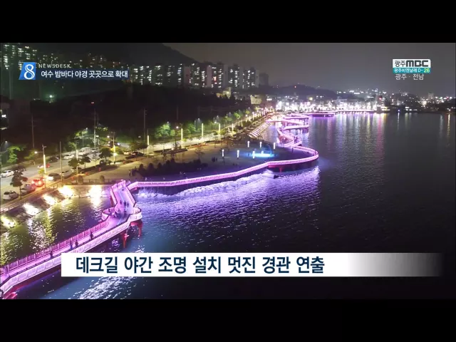 ◀ANC▶ 관광객들로 부터 인기를 얻고 있는 '여수 밤바다'하면 해양공원 일대 아름다운 야간 경관을 들 수 있습니다. 여수시가 밤바다 야경을 다른 해안가 곳곳으로 확산시켜 관광객들을 불러 모으고 있습니다. 김종태 기자가 취재했습니다. ◀END▶ 여수시 소호동 해안가 해안가 바다 위로 7백여미터의 데크길이 길게 들...