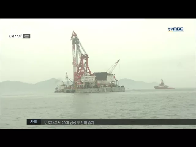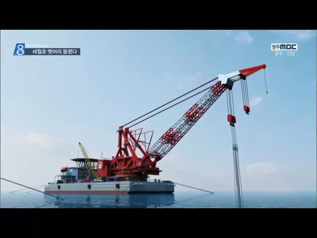 ◀ANC▶ 그제(12일)까지만 해도 순조로워 보였던 세월호 선수들기 작업이 너울성 파도 때문에 중단됐습니다. 목표치의 절반 가까이 들어올렸던 뱃머리가 다시 내려 앉으면서 작업은 또 다시 2주가 연기됐고, 선체 일부가 손상됐습니다. 김진선 기자입니다. ◀END▶ ◀VCR▶ 이번 물때에 마무리할 계획이었던 세월호 뱃...