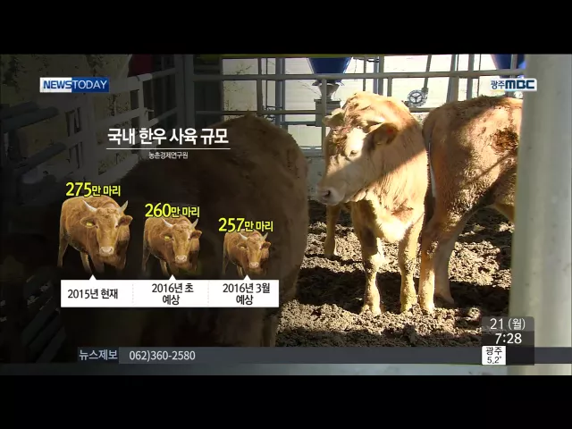 ◀ANC▶ 한우값 고공행진에 축산농민들이 즐거운 비명을 지르고 있습니다. 비싼 송아지 값에 사육 규모는 줄고 있어 한우값 강세는 계속될 전망입니다. 양현승 기자가 취재했습니다. 동이 트지 않은 새벽, 전남의 한 가축시장. 경매에 나온 소 울음소리로 가득 찼습니다. ◀SYN▶ "7시 15분까지 암소 비육우 1차 경매가 ...
