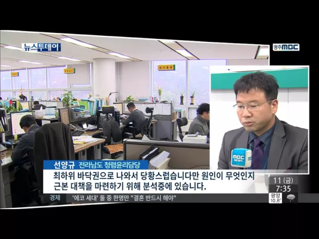 ◀ANC▶ 전라남도가 국민권익위의 청렴도 평가에서 17개 시도 가운데 16위에 머물러 뒤숭숭합니다. 올해는 청렴도 향상 종합대책을 마련해 추진했지만 이같은 성적표를 받아서 문제가 더욱 심각하다는 지적입니다. 최진수 기자가 보도합니다. ◀END▶ ◀VCR▶ 국민권익위 청렴도 조사는 외부청렴도와 내부청렴도 정책고...