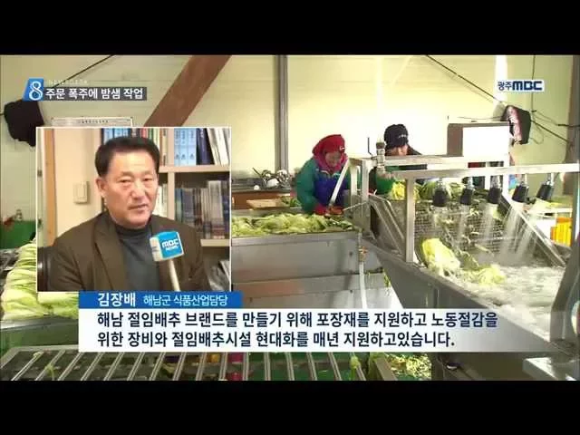 ◀ANC▶ 요즘은 김장할 때 절임배추를 쓰는 분들이 많은데요. 김장철인 요즘 배추 주산지인 해남에는 절임배추 주문이 폭주하고 있다고 합니다. 문연철 기자입니다. ◀END▶ ◀VCR▶ 국산 천일염에 절인 싱싱한 배추를 깨끗히 씻고 포장지에 담습니다. 요즘 간편함 때문에 큰 인기를 끌고 있는 절임배추입니다. 김장철인...