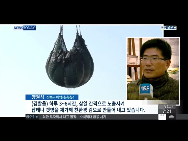 ◀ANC▶ 김 양식과정에서 불순물을 제거하기 위해 유기산을 등을 쓰는데요. 이런 산을 전혀 쓰지 않은 장흥 무산 김이 국내뿐만 아니라 해외에서도 선풍적인 인기를 끌고 있습니다. 문연철 기자가 보도합니다. ◀END▶ ◀VCR▶ 바다에서 갓 채취한 물김을 세척하고 김을 건조해 자르는 작업이 한창입니다. 올들어 첫 선...