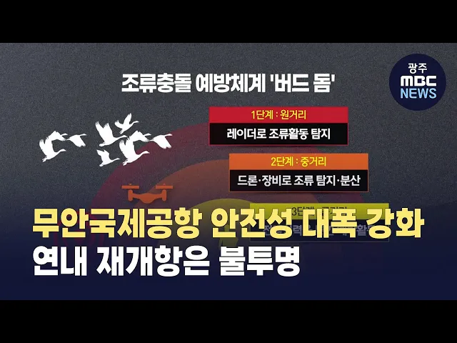 (앵커)지난해 말 여객기 참사가 발생한 무안국제공항의 항공 안전이 획기적으로 개선될 것으로 보입니다.활주로가 연장되고 국내 최초로 조류탐지 레이더가 설치되지만, 연내 재개항 여부는 여전히 불투명합니다.김 윤 기자가 보도합니다.(기자)정부가 내놓은 무안국제공항의 '항공안전 혁신 방안'입니다.여객기 충돌로 큰 ...