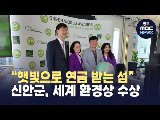 (앵커)신안군이 세계적인 환경 시상식에서 친환경 정책으로 또 한 번 주목받았습니다.주민과 에너지 수익을 나누는 ‘햇빛연금이 국제적으로도 높은 평가를 받으며,뉴질랜드에서 열린 '그린월드어워즈'에서 금상의 영예를 안았습니다.문연철 기자입니다.(기자)신재생에너지의 섬, 신안군이 세계 4대 환경상 중 하나인‘그린월...