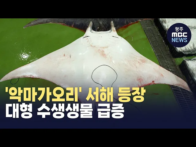 (앵커)태평양 등 아열대 해역에 출몰하는쥐가오리, 일명 '악마 가오리'가전남 서해 바다에 나타났습니다.이달초 여수 앞바다에서 발견된향고래에 이어 대형 수생생물의출몰이 잦아지고 있습니다.안준호 기자가 취재했습니다.(기자)수장고 안 거대한 유리상자에낯선 생물이 담겨있습니다.머리에 달린 거대한 뿔은마치 악마를...