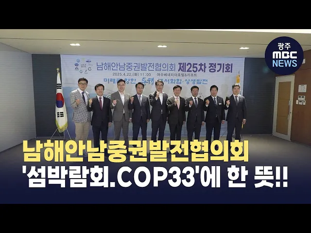 (앵커)2011년에 출범한 남해안남중권발전협의회는 지자체 협력의 성공한 모델로 꼽힙니다.그동안 다양한 정책 사업을 발굴 추진해 온권역내 9개 시.군이이번에는 섬박람회와 COP33 유치에적극 협력하기로 했습니다.최우식 기자가 보도합니다.(기자)영.호남 9개 시.군이 참여하고 있는남해안남중권 발전협의회는지난 2011년 ...