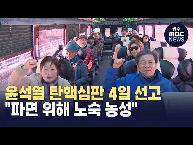 (앵커)전남에서도 파면 선고를 촉구하기 위해상경 노숙투쟁에 동참했습니다.최종 파면 결정이 내려질 때까지긴장감을 늦추지 않겠다며각오를 다지고 있습니다.김규희 기자가 보도합니다.(기자)시민들이 침낭부터 돗자리, 생수까지 모두 대형버스 짐칸에 싣습니다.윤 대통령 파면 선고를 촉구하기 위해전남에서도 대거 상경...