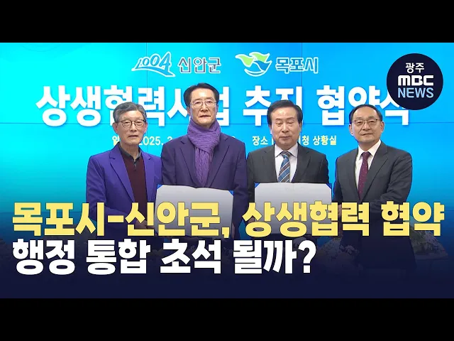 (앵커)목포시와 신안군이 지역 간 협력을 강화하기 위해 상생협력사업 업무협약을 체결했습니다.단순한 협력을 넘어 행정 통합의 초석이 될 수 있을지 주목됩니다.문연철 기자가 보도합니다.(기자)목포시와 신안군이 손을 맞잡고 상생협력사업을 위한 업무협약을 체결했습니다.이번 협약에는 4개 분야, 24개 협력 사업이 포...