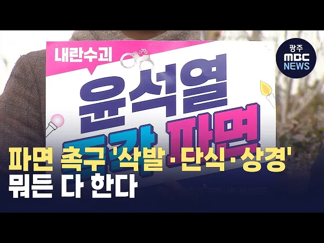 (앵커)윤석열 대통령 즉각 파면을 외치는 목소리는전남에서도 거세지고 있습니다.정치권과 시민사회는단식과 삭발, 상경 집회까지할 수 있는 건 전부 다 하겠다는 각오입니다.유민호 기자입니다.(기자)거리의 천막 앞에 앉은 여수시의원들.하얀 가운 위로 머리칼이 툭툭 떨어집니다.윤석열 대통령 즉각 파면을 외치며 삭발...