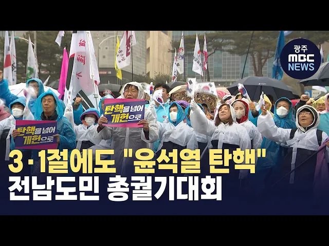 (앵커)윤석열 대통령 탄핵 심판 선고가 임박한 가운데즉각 파면과 내란세력 청산을 촉구하는 전남도민 총궐기대회가 어제, 3·1절을 맞아 열렸습니다.궂은 날씨에도 주최 측 추산 3천여 도민들은 대규모 행진을 하며, 훼손당한 민주주의의 온전한 부활을 바랐습니다.김규희 기자입니다.(기자)비가 내리는 날씨에 형형색색의 ...