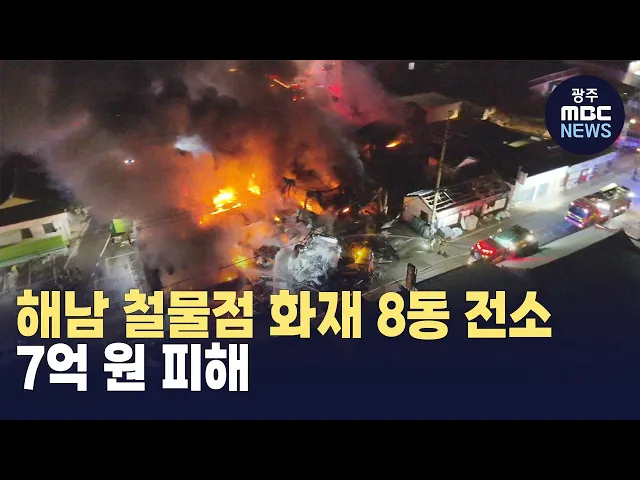 (앵커)어젯밤(24) 해남의 한 철물점에서 불이 나인근 주택과 상가 등 8개 동이 모두 탔습니다.다행히 인명피해는 없었지만,7억 원 이상의 재산피해가 났습니다.김규희 기자가 보도합니다.(기자)회색 연기가 하늘을 뒤덮고, 곳곳에 번진 불길이 활활 타오르고 있습니다.어젯밤(24) 8시쯤 해남의 한 철물점에서불이 나 마을 ...