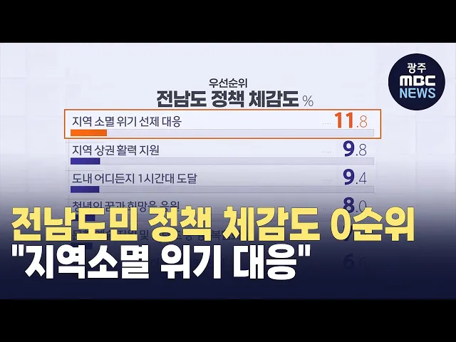 (앵커)전남의 도민들은전남도가 추진하는 미래산업들에 대해어떻게 평가하고 있을까요?MBC가 여론조사 전문기관인엠브레인 퍼블릭스와 온라인 패널조사를해봤더니, 심각한 인구위기를 반영하듯지역소멸 위기 선제 대응을꼽는 도민들이 가장 많았습니다.서일영 기자가 보도합니다.(기자)지난 2023년 기준 전남의 고령화 비율...