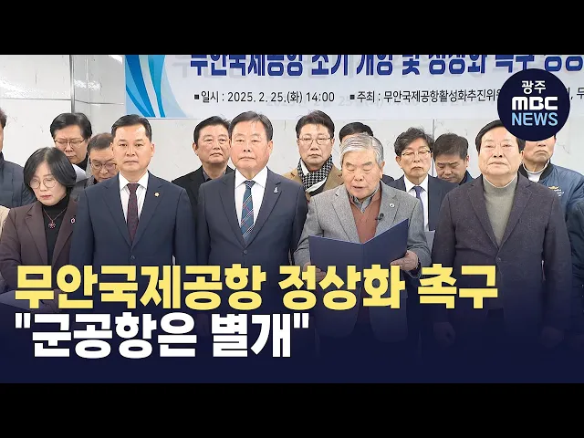 (앵커)광주시가 광주공항의 국제선 임시 취항을 요구한 이후무안군과 군민들이 처음으로공식 기자회견을 열었습니다.국토부에 무안공항 조기 정상화를 위해직접 나서달라고 요구했습니다.군공항 이전과는 결부시키지 말라면서도정작 구체적인 대책은 내놓지 못했습니다.서일영 기자가 취재했습니다.(기자)광주시의 광주공항...
