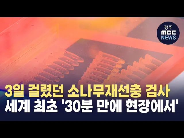 (앵커)소나무를 말려 죽이는 소나무재선충은 치료가 불가능해 해마다 많은 산림 피해를 낳고 있습니다.진단에만 3일이 걸려 조기 선별이 어려웠던 소나무재선충 검사를 30여 분만에 단축시킨 기술이 개발됐습니다.안준호 기자가 취재했습니다.(기자)소나무 톱밥을 담가뒀던 시약을1.5cm 가량의 작은 키트에 떨어뜨립니다.DN...