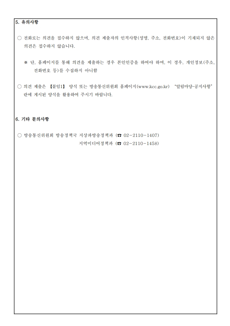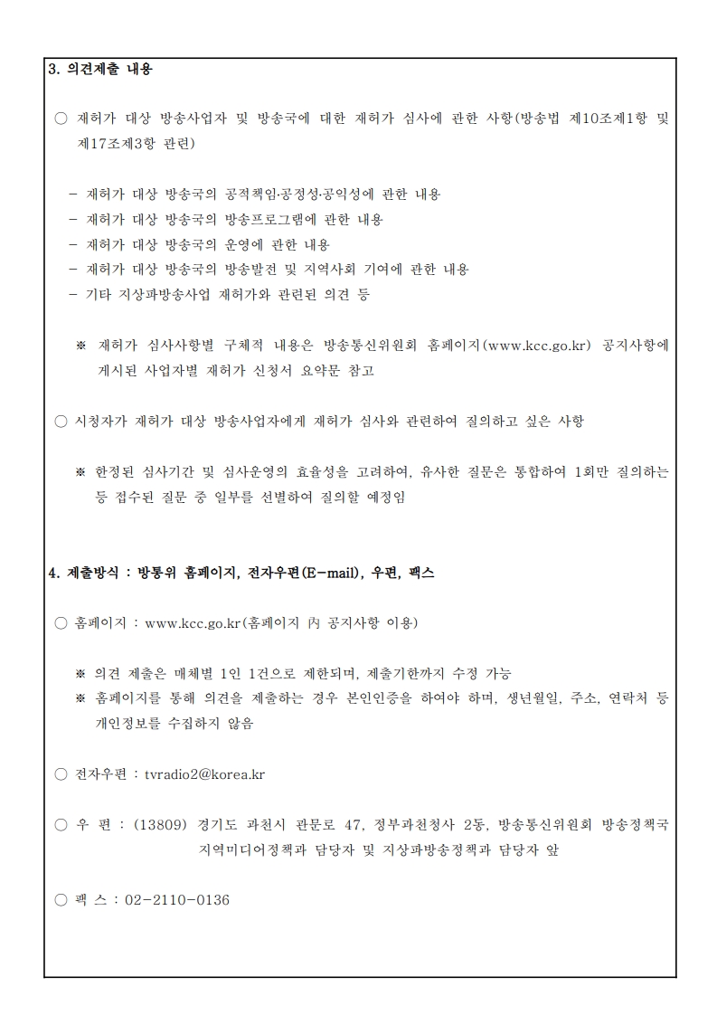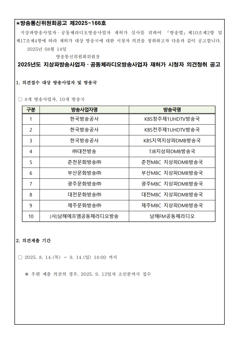 공지사항 2025년도 지상파방송사업자, 공동체라디오방송사업자 재허가 시청자 의견청취 공고 등록일 : 2025-08-12 15:08 조회수 : 1050 첨부파일 [붙임1] 방송통신위원회공고제2025-166호(2025년도 지상파방송사업자·공동체라디오방송사업자 재허가 시청... (216.17 KB) 다운로드 이전글 다음글 목록