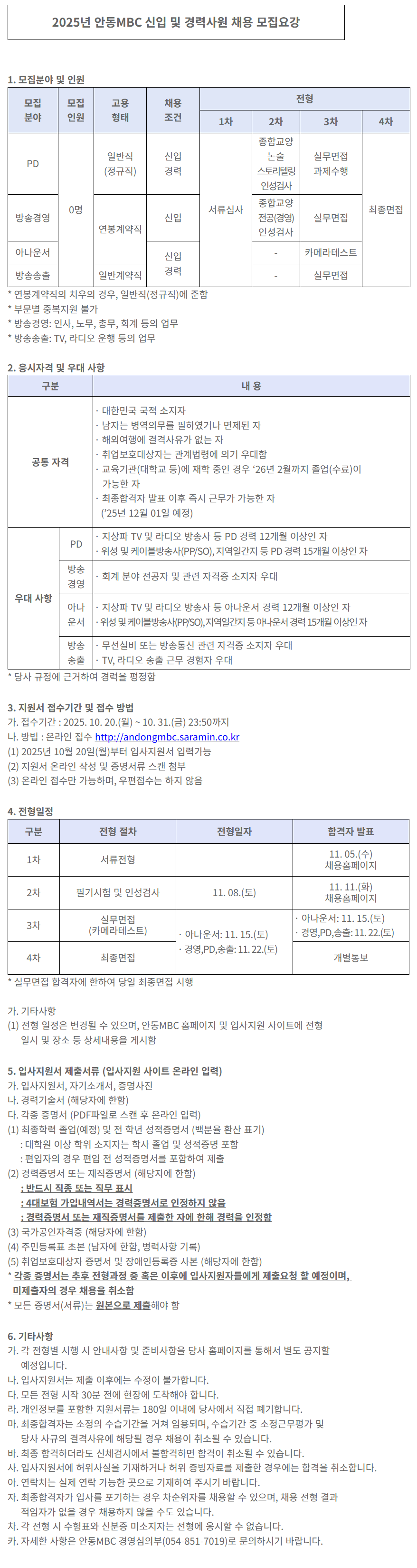 공지사항 2025 안동MBC 신입 및 경력사원 채용 모집요강 등록일 : 2025-10-20 08:18 조회수 : 341 첨부파일 2025+안동MBC+신입+및+경력사원+채용+모집요강.pdf (52.61 KB) 다운로드 이전글 다음글 목록
