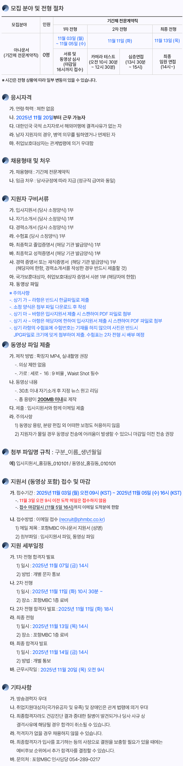 공지사항 포항MBC 기간제 전문계약직 아나운서 채용 공고 등록일 : 2025-11-03 10:41 조회수 : 210 포항MBC 기간제 전문계약직 아나운서 채용 공고 *입사지원서 양식 내려 받기 등 채용에 관한 사항은 포항MBC 홈페이지를 참고바랍니다. 이전글 다음글 목록