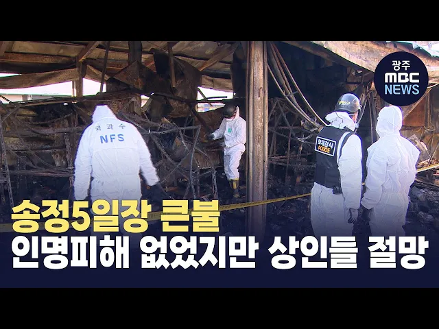 (앵커)오늘(14) 새벽 광주 송정 5일장에서큰불이 났습니다.다행히 인명피해는 없었지만, 많은 점포들이 불에 탔는데요.물건들이 전부 타버린 모습을 본 상인들은한숨만 쉬고 있습니다.천홍희 기자가 취재했습니다.(기자)광주 전통시장의 한 점포에서불길이 치솟습니다.뭔가 터지는 소리가 나면서 점점 불이 번지고,지켜보던...
