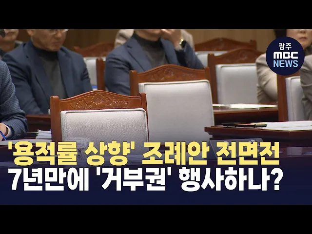 (앵커)오늘(12) 광주시의회에서 통과된 중심상업지구 용적률 상향 조례를 두고 광주시와 시의회가 정면충돌 양상을 보이고 있습니다.강기정 시장이 본회의 불출석에 이어거부권에 해당하는 재의 요구 행사를 검토하자의회도 물러서지 않겠다며 맞서고 있습니다.주현정 기자입니다.(기자)광주시의회 임시회 본회의장.강기정 ...