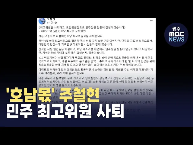 주철현 더불어민주당 전남도당위원장이당대표 지명직 최고위원 임명 4개월만에 자진 사퇴했습니다.여수갑 국회의원인 주 위원장은오늘(31) 광주MBC와의 통화에서 "지난해 도당위원장 취임 직후 최고위원으로 임명되면서 본업인 '호남 목소리 대변인' 역할에는 집중하지 못했던 것이 사실"이라며,"앞으로는 민주정권 재창출 ...