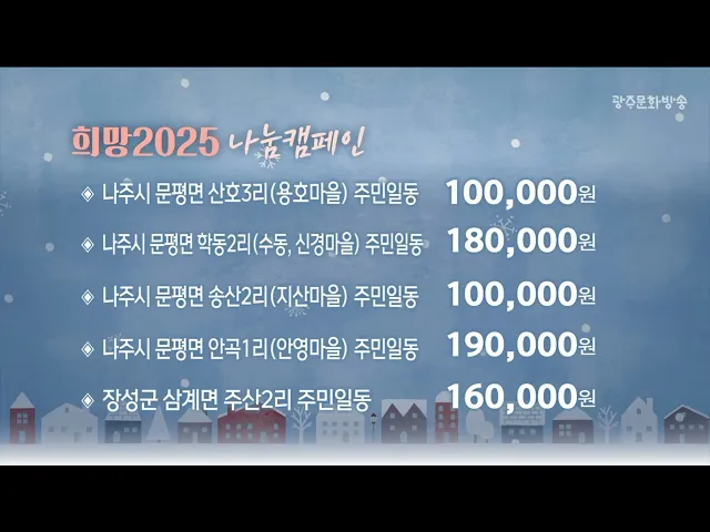 '희망 2025 나눔 캠페인'에 성금을 보내주신 분들입니다.영광군 대마면 화평2리 주민일동 144,000영광군 대마면 원흥3리 주민일동 114,000영광군 대마면 복평2리 주민일동 141,000나주시 문평면 학동1리(덕산, 봉학마을) 주민일동 140,000나주시 문평면 대도1리 이종수 100,000나주시 문평면 산호3리(용호마을) 주민일동 10...