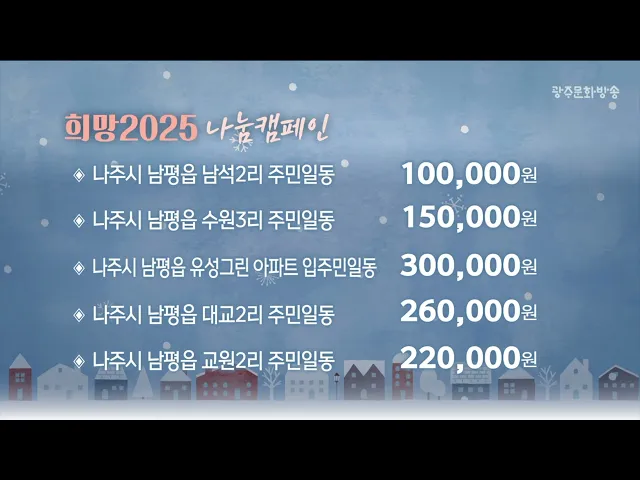 '희망 2025 나눔 캠페인'에 성금을 보내주신 분들입니다.담양군 담양읍 학동1리 주민 249,000담양군 담양읍 객사2리 경로당 100,000담양군 담양읍 관우 할머니 경로당 100,000담양군 담양읍 반룡3리 주민 100,000담양군 담양읍 강쟁2리 주민 200,000담양군 담양읍 반룡1리 주민 150,000담양군 담양읍 반룡2리 주민 100,000...