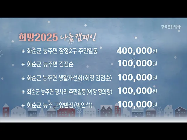 '희망 2025 나눔 캠페인'에 성금을 보내주신 분들입니다.영천10단지 삼일회 200,000영천10단지 주민일동 800,000(주)제이앤씨우드테크 목재사.com 임직원일동 500,000금광하늘연가아파트 1,000,000구립쌍용아이캐슬어린이집 최현옥원장 외 58명 원아일동 589,690화순군 화순읍 도웅1리 주민일동 150,000화순군 화순읍 감도1...