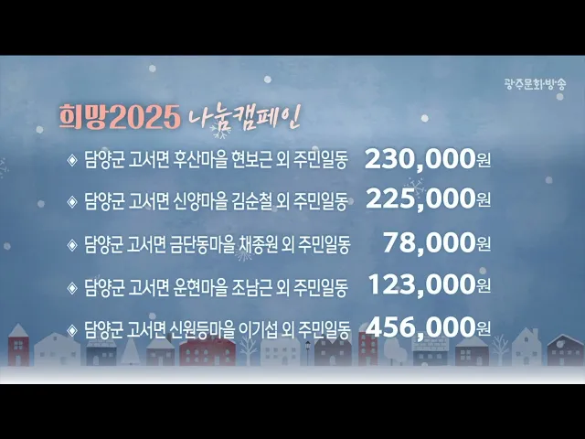 '희망 2025 나눔 캠페인'에 성금을 보내주신 분들입니다.담양군 고서면 노채마을 박삼수 외 주민일동 100,000담양군 고서면 내보마을 박광자 외 주민일동 174,000담양군 고서면 증암마을 조금표 외 주민일동 150,000담양군 고서면 덕촌마을 홍은자 외 주민일동 252,000담양군 고서면 성산마을 류광호 외 주민일동 186,000담...