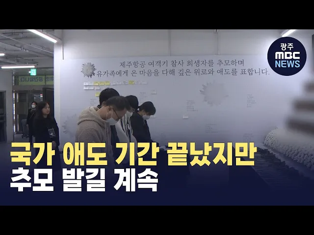 (앵커)제주항공 여객기 참사에 따른 국가 애도 기간이 어제(4일)로 끝났지만,추모의 발길은 계속 이어지고 있습니다.시민들은 직접 쓴 편지와 국화꽃을 남기며희생자들을 애도했습니다.보도에 김영창 기자입니다.(기자)광주 5.18민주광장에서광주 동구 전일빌딩 1층으로 옮겨진 제주 항공 참사 희생자 합동 분향소.7일 간의...