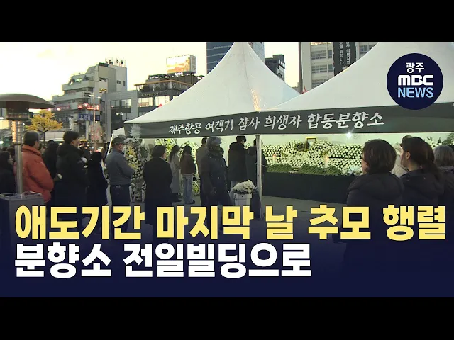 제주항공 여객기 참사 애도 기간 마지막 날인 오늘도 5.18민주광장 합동 분향소에 추모의 행렬이 이어졌습니다.2025년 첫 주말은 맞은 시민들은 오전부터 5.18민주광장 합동 분향소를 찾아 희생자들의 명복을 빌고 철저한 사고 조사와 재발 방지를 통해 안전한 사회가 이뤄지길 기원했습니다.광주시는 정부가 정한 애도 기...