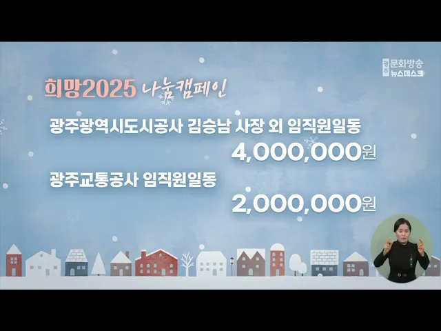 '희망 2025 나눔 캠페인' 에 성금을 보내주신 분들입니다.광주광역시도시공사 김승남 사장 외 임직원일동 4,000,000광주교통공사 임직원일동 2,000,000한국도로공사서비스 광주전남영업센터 3,000,000